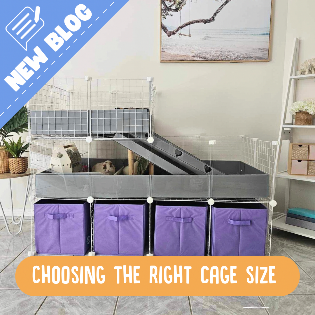 "Guinea Pigs are small - they don't need a lot of space!" - FALSE One of the first and most important parts of guinea pig ownership, is providing them with an appropriate cage or housing option. The average lifespan of indoor guinea pigs is also about 5-7 years, so it is important they have an enriching and stimulating environment as over this time they can easily become bored in a small space! Unfortunately many of the commercial cages marketed for guinea pigs, for example many of those found in pet stores, are not actually suitable to house our piggies and keep them happy and healthy. Guinea pigs may be small animals, however they need a LOT more space than people realise to zoom, popcorn and stretch their legs - and providing them with ample space to move also helps to avoid a tonne of serious health issues!  History of Guinea Pig Housing:  Going back 20, or even 10 years ago, we didn’t understand the full animal welfare needs of guinea pigs and the requirements needed for them to express their natural behaviours like they would in the wild. Thankfully animal welfare has come a long way since then, and guinea pigs have now become valued members of the family, with a lot more research into adequate welfare standards!  Previously, it was very common for guinea pigs to be housed full time in outdoor hutches, where they were susceptible to unpredictable environmental changes including both heat stress and cold stress, as well as predators such as dogs, cats, snakes and birds. Living outdoors generally means they had a lot less interaction with family members.  A lot of the older cages, and even many still on the market today, have wire bottom flooring, which we now know is very irritating to their little paws and predisposes to the development of foot ulcers and bumblefoot - which can in the severe cases be life threatening!   Even now a lot of cages available in pet shops do not meet the minimum size requirements for guinea pigs, hence why today I’m going to be focusing on choosing the right Ozzy Cage for your family and piggies.  Cage Setup Considerations So firstly, you need to know how many guinea pigs you are going to house, and what sex they are. As guinea pigs are such social animals it is always recommended to house a minimum of 2 together so they have a friend. FUN FACT: Switzerland has passed legislation making it illegal to only own 1 guinea pig, in order to fulfill their requirements for social interactions.  Generally, if you are going to house two or more male guinea pigs together your cage size should be a touch larger to give them some more space. Boars especially can be extremely territorial and for the safety of your guinea pigs should have enough space to have “time out” from each other to prevent fighting and injuries.  The great thing however about Ozzy cages, is that if you ever get more guinea pigs or change combinations, it’s easy to expand your cage either in length or by adding multiple levels.   Minimum Cage Size: The area for our critters must be as spacious as possible. Cavies need at least 70 square centimetres of cage space each to be happy and healthy. Male guinea pigs need even MORE room - at least 1 square metre of cage space each, to prevent fights over territory. See our chart below for ideal cage size vs. how many piggies you have.  Multi-Level Cages: Cages with multiple levels can be beneficial as long as they provide safe, easy access between levels with ample floor space. These cages should still meet the minimum floor space requirements, but the extra levels can provide additional enrichment and exploration opportunities. ⚠️ WARNING: A lot of 'vertical style' cages are marketed for guinea pigs but they are not suitable! They often have steep, short ramps and very limited area for your piggies to move around. The height of these levels are also dangerous for guinea pigs if they fall. While these cages are great for mice and rats that can climb, they are unsafe and unsuitable for guinea pigs. Ozzy cages have developed safe ramps specifically designed for the body shape and mobility of guinea pigs in mind - these ramps are not excessively steep, are safe and sturdy, have carpet grip and have a cover add on to prevent the risk of any accidents. Shop our Ozzy Ramps here.    Benefits of large cages and floor space:  Ability to express natural behaviours: Guinea pigs need a large area to explore, popcorn, rumblestrutt, and run laps, and this requires a certain degree of space. They should be able to exhibit and effectively communicate with one another without having objects or walls preventing this or getting in the way.  Exercise: Larger cages allow your pets to move around freely, promoting exercise, preventing obesity, and improving overall health.  Mental Stimulation: A larger cage provides more opportunities for mental stimulation through exploration, hiding spots, and different areas to investigate, reducing boredom and encouraging natural behaviors! Social Interaction:  Larger enclosures can accommodate critters social nature, allowing for more harmonious interactions and reducing fights. Improved Health: Critters who receive regular exercise are less prone to obesity related issues such as liver, heart and respiratory distress and disease. Boars will also be less prone to developing impaction problems.  Enrichment: You can add various toys, tunnels, platforms, and hideouts in a larger space, enhancing the environment and encouraging natural behaviors like foraging and exploring. Check out our store for lots of playtime goodies! Easier Maintenance: Believe it or not, a larger cage often means easier and less frequent cleaning as poops are more dispersed! It can also be easier to spot clean and maintain hygiene in a larger space. Guinea pigs will commonly poop in the corners of the cage, which means they aren't left to sit in their faeces and can move away to different areas for living and napping.  Co