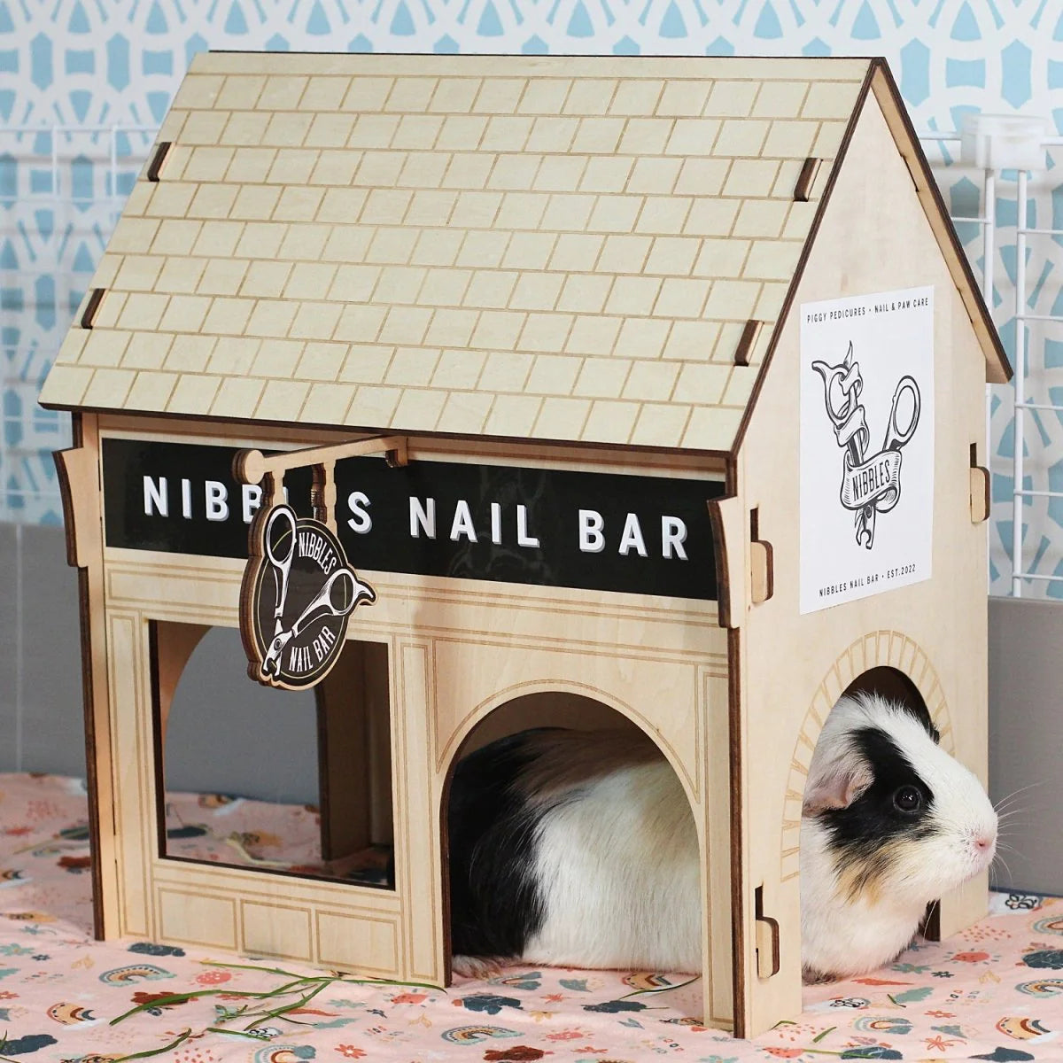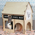 Nibbles Nail Bar is designed to provide your guinea pigs with the perfect den to hideout in, play and sleep in. They are simple to construct and can be flat-packed for easy storage. We’ve decorated the wood with laser-etched detailing and you’ll also receive a set of stickers to customise the outside of your house with quirky signage.