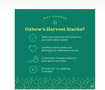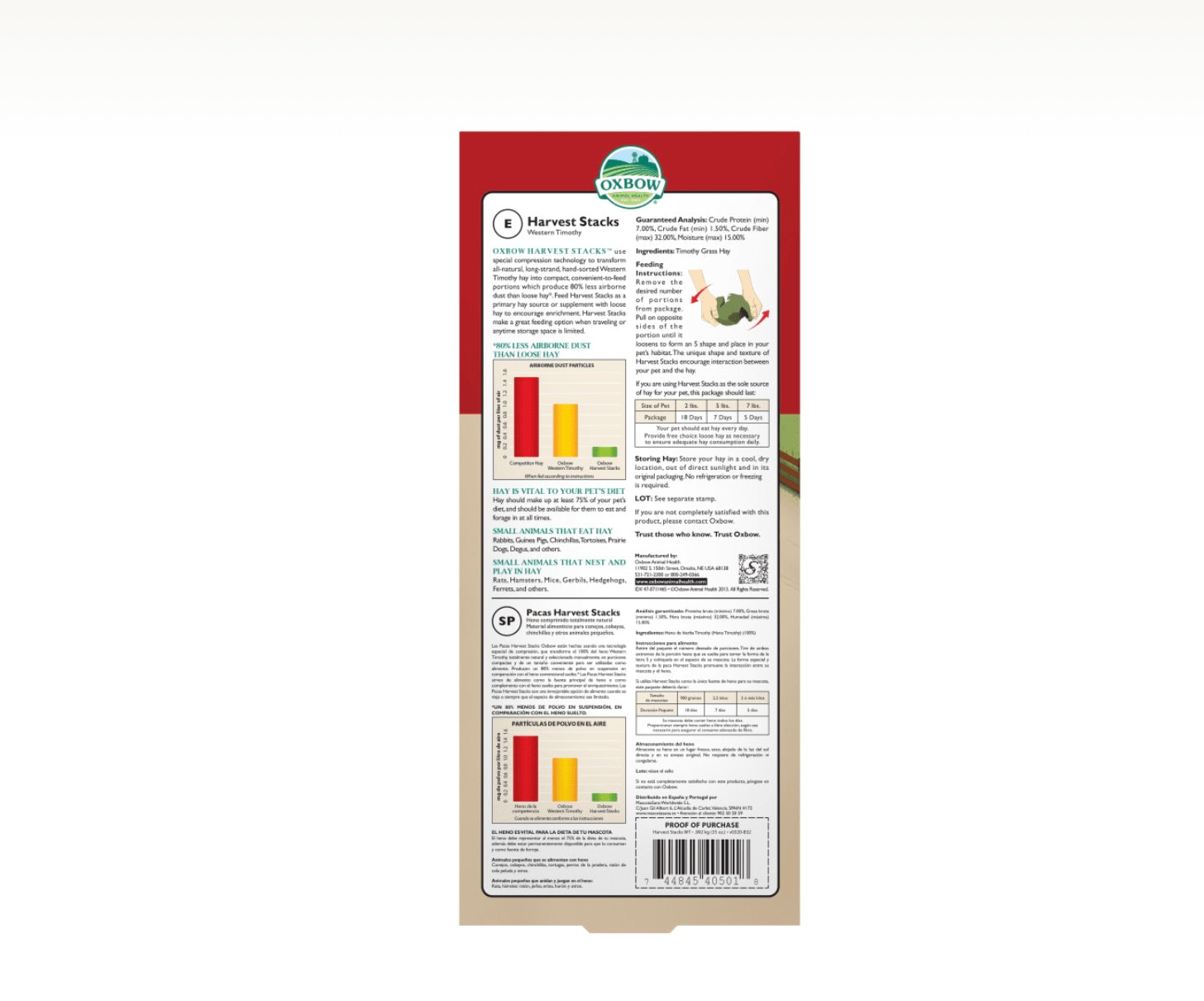 Oxbow Harvest Stacks are the latest in hay innovation.  Using special compression technology, we transform 100% all-natural, hand-sorted Oxbow Western Timothy hay into compact, convenient-to-feed portions which produce 80% less airborne dust than loose hay when fed according to instructions.  Feed Harvest Stacks as a primary hay source or supplement with loose hay to encourage enrichment.  Harvest Stacks make a great feeding option when traveling or anytime storage space is limited.