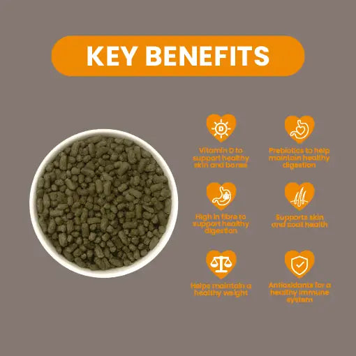 Analytical constituents: Beneficial fibre 40%, Crude Protein 14%, Crude Fat 4%, Crude Fibre 20%, Crude Ash 7.5%, Calcium 0.8%