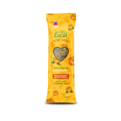 Indulge your small furry friend with our Excel Forage & Feast Hay Bar, topped with tasty marigold flowers. This high-fibre treat is made with natural ingredients to support your pet's health while satisfying their natural foraging instincts. Perfect for rabbits and guinea pigs.