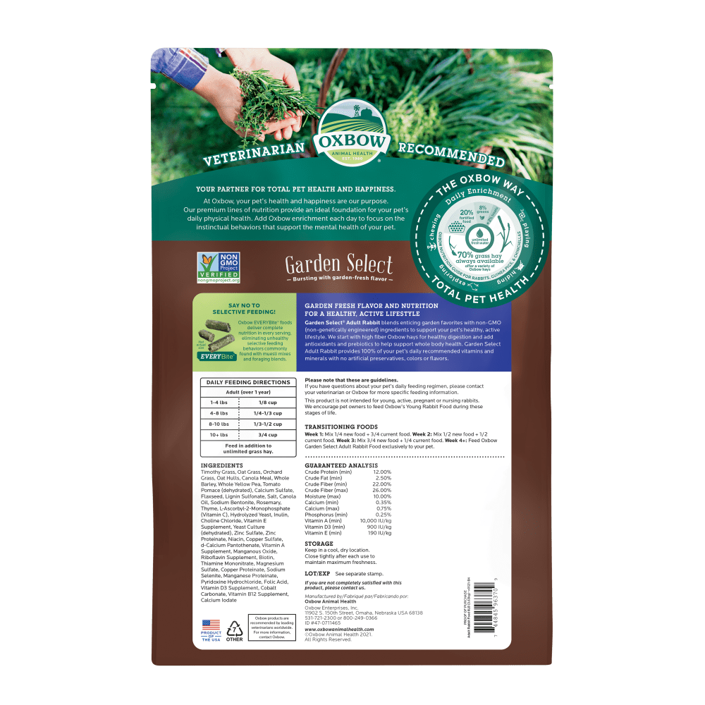 Garden Select® Adult Rabbit blends enticing garden favorites with non-GMO (non-genetically engineered) ingredients to support your pet’s healthy, active lifestyle. We start with high fiber Oxbow hays for healthy digestion and add antioxidants and prebiotics to help support whole body health. Garden Select® Adult Rabbit provides 100% of your pet’s daily recommended vitamins and minerals with no artificial preservatives, colors or flavors.